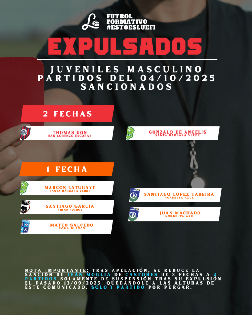 BBlog Sancionados Juveniles LUEFI – Partidos del 4 de octubre de 2025 porLUEFI9 octubre, 2025 Tags:expulsadosfutbol juvenilliga luefitribunal de disciplina LUEFI