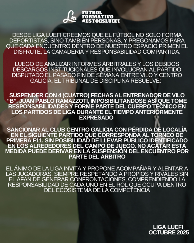 BBlog Tribunal de disciplina – Resolución Primera F11 – porLUEFI11 octubre, 2025 Tags:expulsadosfutbol juvenilliga luefitribunal de disciplina LUEFI