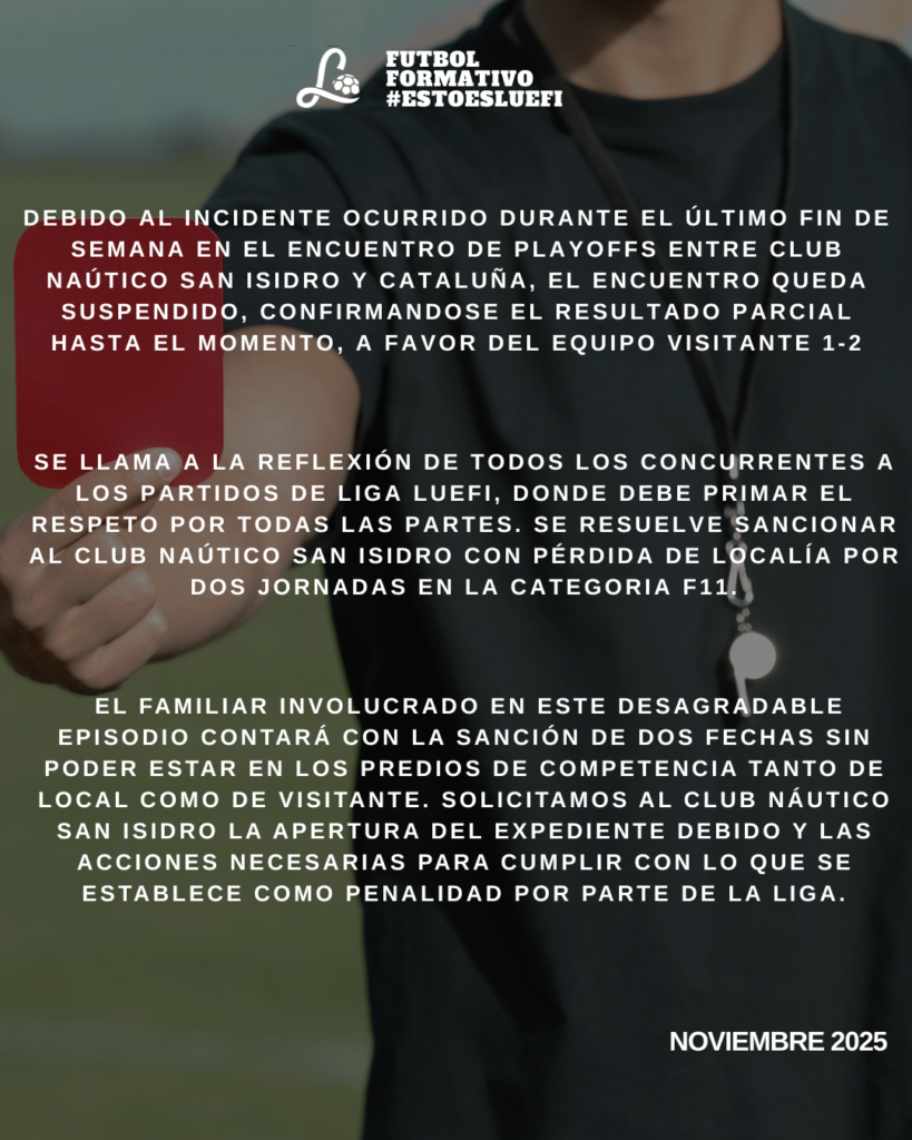 BBlog Tribunal de disciplina – Sobre los hechos ocurridos en el encuentro Club Nautico San Isidro – Cataluña porLUEFI6 noviembre, 2025 Tags:expulsadosfutbol juvenilliga luefitribunal de disciplina LUEFI